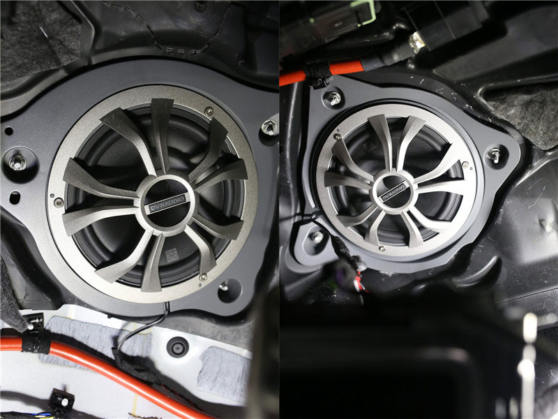 此次音响升级,根据车主需求前门喇叭保留了原车高音单元,选用丹拿SURPAX M17S低音喇叭和SURPAX M17B中音喇叭原车无损对插更换;与此同时后门喇叭也增加了一对丹拿SURPAX M17B中音。